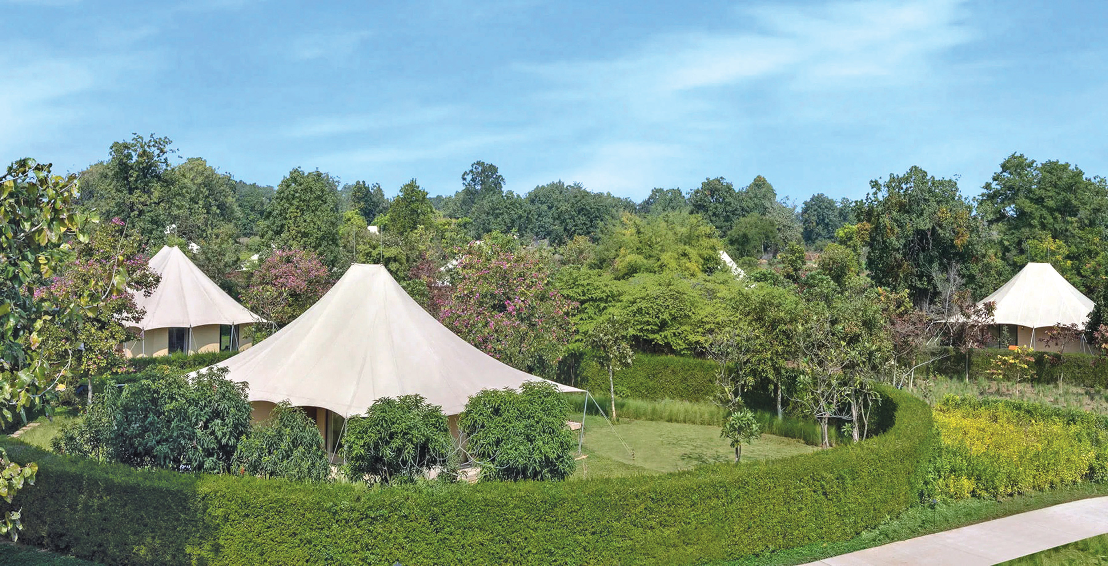 The resort is set across 25 acres and features 19 luxury tents and an executive suite, along with a public building housing a library, bar, all-day dining restaurant, and a wellness spa. Inspired by the philosophy of “being one with nature”, the resort is designed to offer an immersive stay rooted in sustainability and environmental stewardship.
