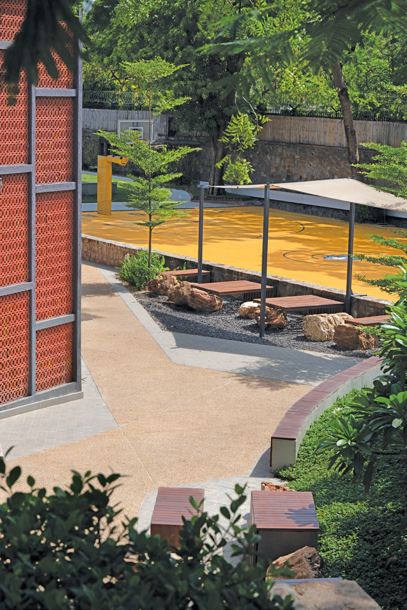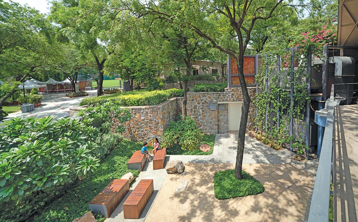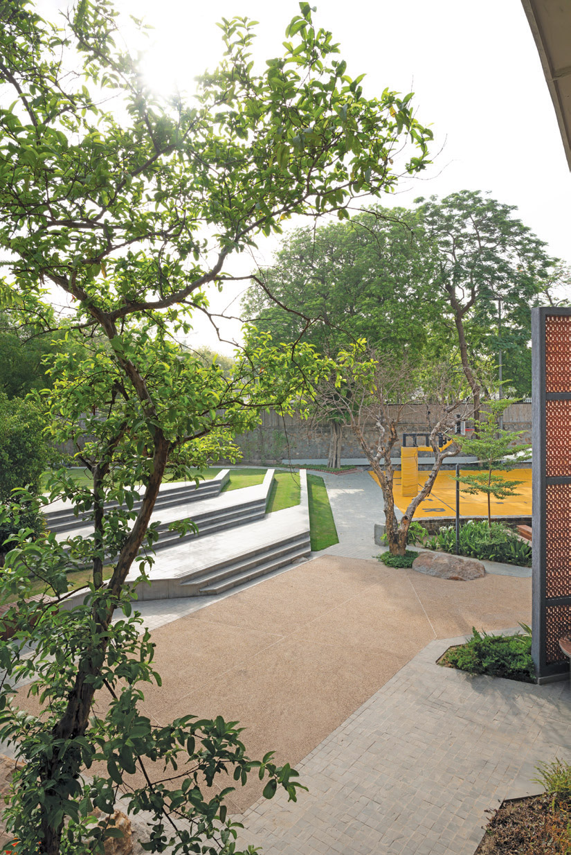 | The design encompasses a 1.25-acre of the school area, envisioned as an extended open space that includes a cafe, student activity zone for the robotics workshop and design lab, along with an amphitheatre. By drawing inspiration from Stein’s sensitive use of materials and proportion, the landscape design integrates with the campus’s original character while creating new, adaptable outdoor areas near the workshops and cafeteria. Overlapped benches and tiered, stepped seating create flexible zones for demonstrations, group discussions, and social interaction. The circulation paths act as a connective spine, linking the workshops, play area, and cafeteria into a cohesive whole. These paths are part of a broader walking loop that naturally binds the campus together. Functional overlays have been created to make the most of every square foot. For example, a single area can serve as both an outdoor discussion zone and an extension of the play area, with shifting visual connections that adapt to its use. These “breathing spaces” offer a retreat from the classroom, promoting reflection and conversation.